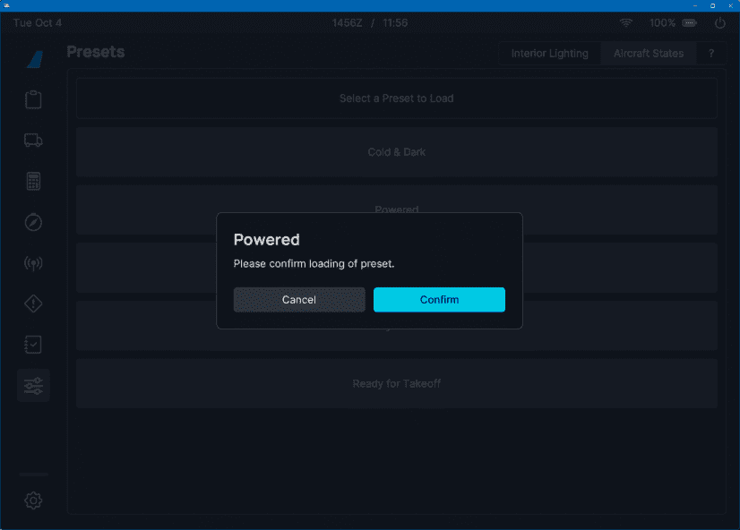 To load a preset, please click on the "Load Preset" button. The aircraft must be powered for the buttons to be enabled.