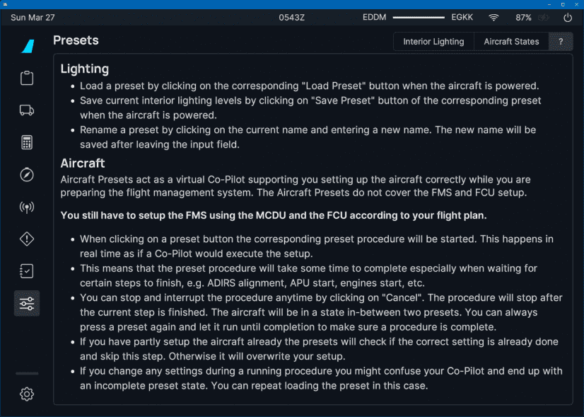 When loading a preset, the virtual co-pilot will perform all necessary setup tasks in real time. Therefore, systems like ADIR alignment, APU start, Engine starts will take the usual time to start up.