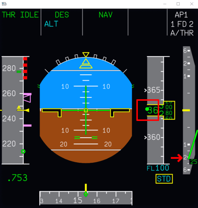 - The V/DEV or "yoyo" indicator. It provides a visual indicator of how far below the descent profile from the command altitude (FL100). In this case, you will notice the aircraft is far below the profile, in part due to starting the descent early.