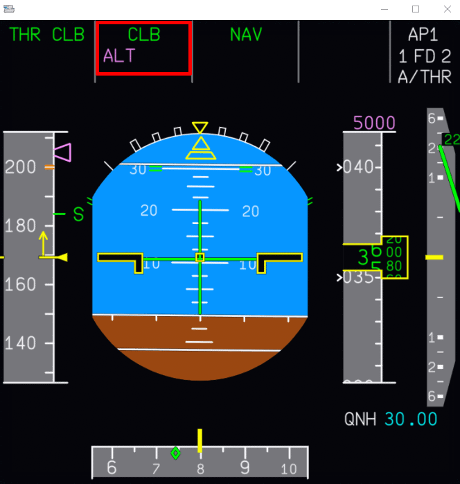 The current mode is CLB but the aircraft has an ALT armed in magenta. This means that the aircraft is ready to level off at 5000 ft and will transition to ALT CST*.