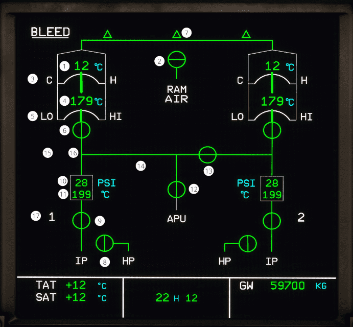 12 APU Bleed valve Green crossline The APU master switch is ON, and the APU valve is partially open.
