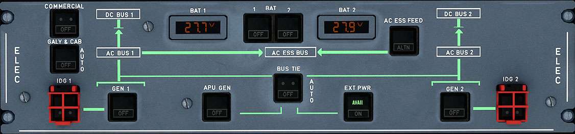• The battery charge limiter is off. The battery line contactor is open. White OFF light comes on when DC BAT BUS is supplied. Hot buses remain supplied.