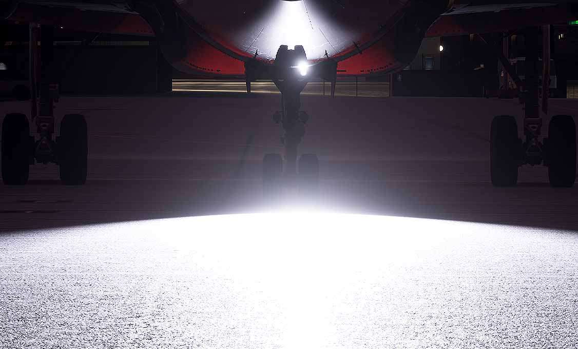 Logo lights are installed in the upper surface of each horizontal stabilizer to illuminate the company logo on the vertical stabilizer, provided the main gear struts are compressed, or the slats are extended.