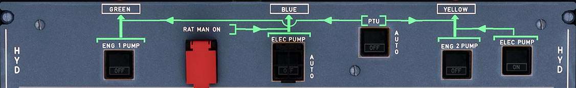 The aircraft has three fully independent hydraulic systems: Green, Yellow, Blue.