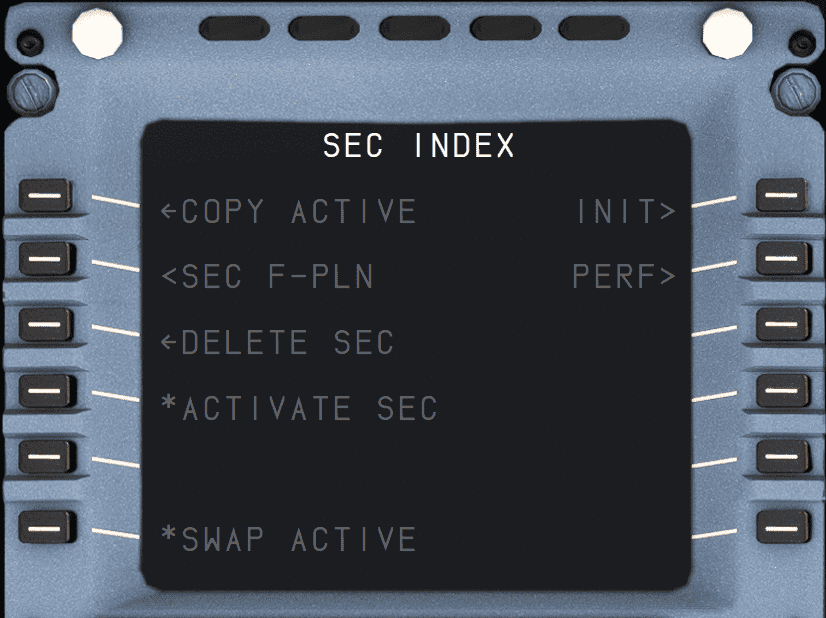 The SEC F-PLN key on the MCDU console allows the flight crew to call up the secondary index page and the secondary flight plan page. The secondary flight plan is generally used to prepare a diversion, an alternate routing, for predictable runway changes at takeoff or landing, or for a next flight. There are two types of secondary index page, depending on whether a secondary flight plan has already been defined.