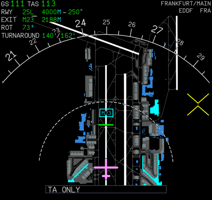 After selecting a runway, OANS displays two magenta lines projecting the required minimal stopping distance for DRY and WET conditions. The targeted exit should be chosen after the WET line only, this provides a safety margin. To finalize the selection, the runway exit is selected by clicking on the corresponding label. The upper left of the ND now shows: