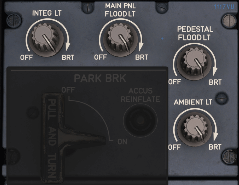 This control adjusts the floodlighting for the main panel, which provides a wash of light over the entire instrument panel. This general lighting is useful when the pilots need to see the entire panel without the need for backlighting on individual instruments.
