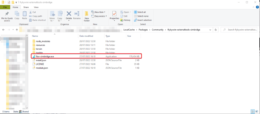 If this is not your preference, or it fails to start, you can also open the tool by opening the fbw-simbridge.exe found in the folder, flybywire-externaltools-simbridge, in the community folder. SimBridge executable location