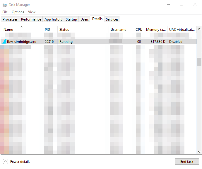 • If you encounter issues when closing SimBridge normally, you can kill the fbw-simbridge.exe process in Task Manager. task manager stop